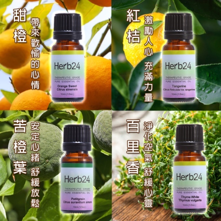 Herb24 純質精油5件組(甜橙、紅桔、苦橙葉、百里香各10ml,6格木盒)