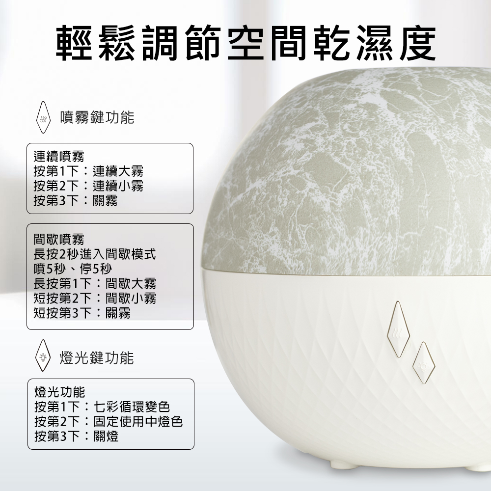 • 2段噴霧模式:連續與間歇模式,且可選大霧或小霧