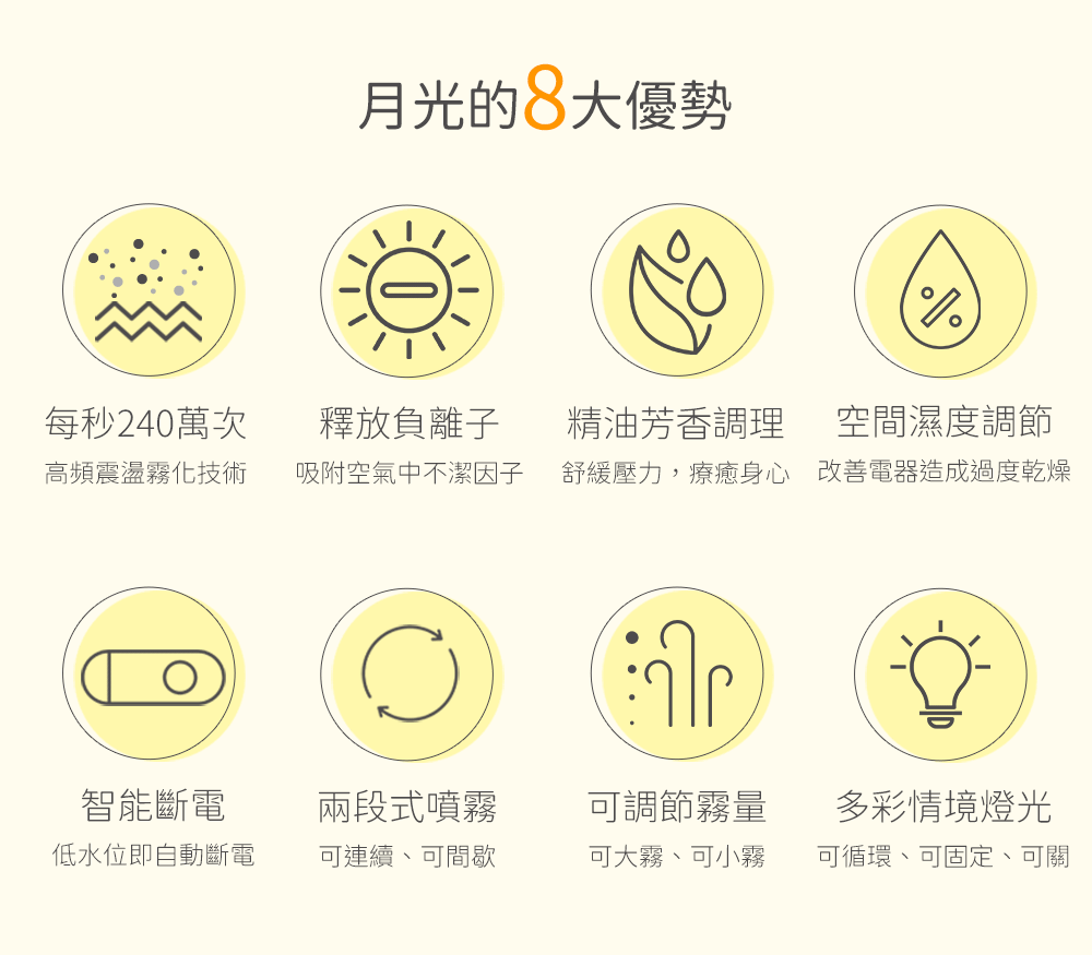 以每秒 240 萬次高頻微震盪,將液態分子霧化為極細分子並釋放大量負離子,清新淨化居家空間,彷彿沐浴在森林中。
