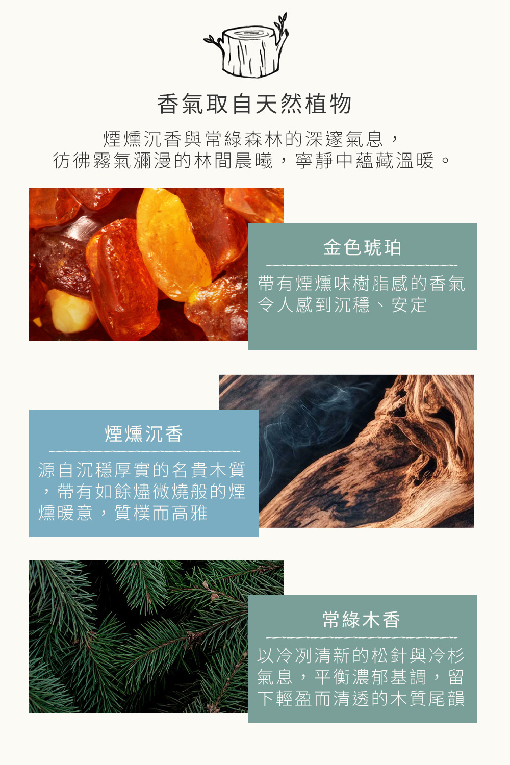 靈感源自煙燻沉香與常綠森林的深邃氣息,彷彿霧氣瀰漫的林間晨曦,寧靜中蘊藏溫暖。清新針葉調融合煙燻木質與金色琥珀,層層堆疊出細緻沉穩的香氛層次,宛如壁爐旁的靜謐時光,溫柔包裹空氣與心緒。