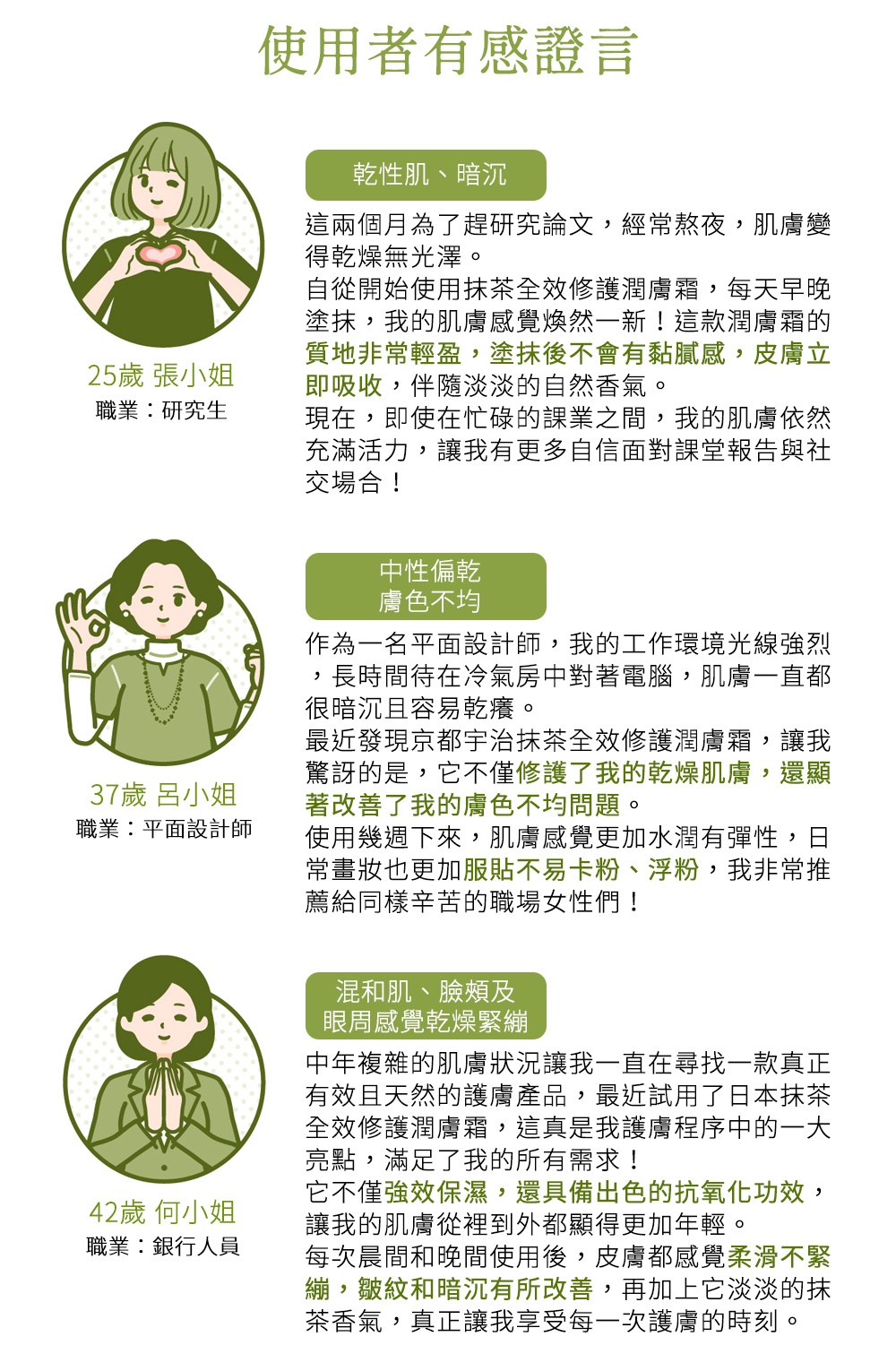 • 用途:每日早晚於抹茶保濕露後,取適量於掌心輕輕按摩肌膚