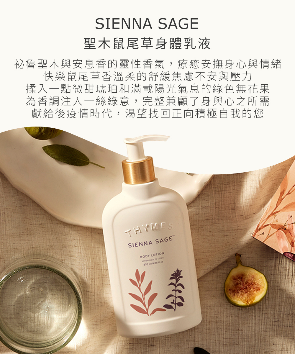 Sienna Sage 聖木鼠尾草系列,透過祕魯聖木與安息香的靈性香氣,療癒安撫身心與情緒。快樂鼠尾草香溫柔的舒緩焦慮不安與壓力,同時揉入一點微甜琥珀和滿載陽光氣息的綠色無花果,為香調注入一絲綠意,完整兼顧了身與心之所需,獻給後疫時代,喜愛清新木質香氣,渴望找回正向積極自我的您。