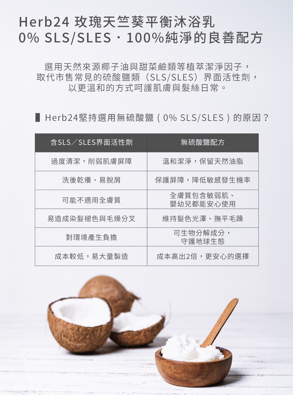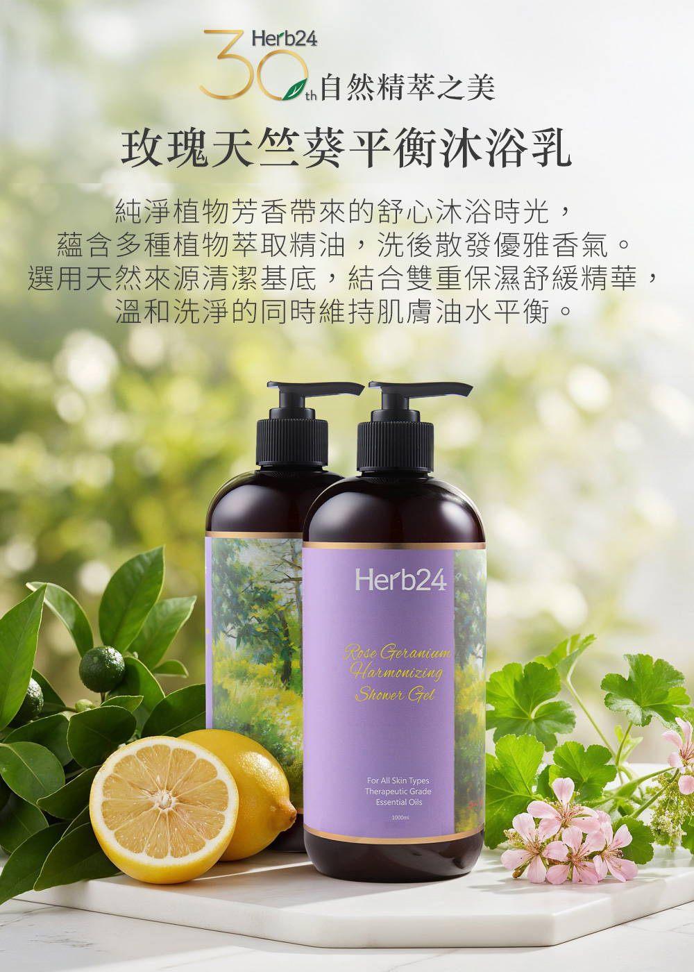 Herb24植萃精油洗沐系列,感受30年的自然精萃之美!富含玫瑰天竺葵、苦橙葉、檸檬等植萃精油,洗後散發優雅香氣,驅散整日 的疲憊心情,在溫和洗淨肌膚的同時注入養分,持久感受絲滑觸感。