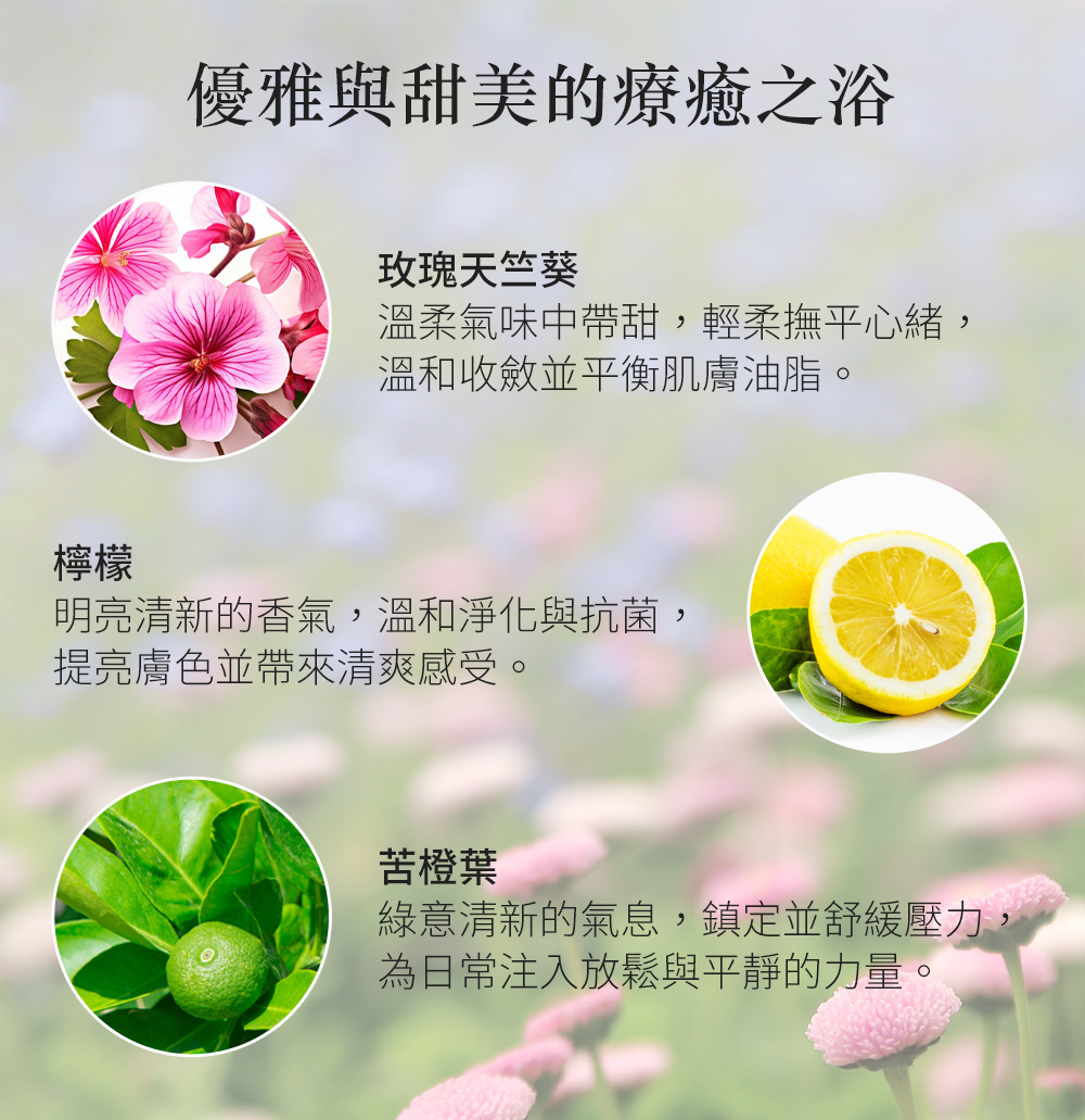 ◆ 花草柑橘交織的平衡之浴◆ 溫和潔淨,調理肌膚◆ 富含玫瑰天竺葵、檸檬、苦橙葉植萃精油◆ 中性、混合性與輕微敏感肌膚適用
