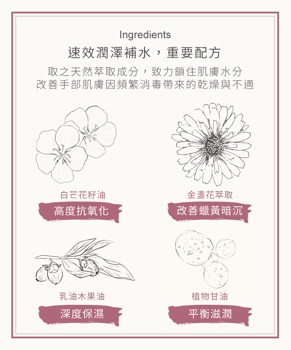 • 使用方式:洗手後或需要滋潤的時候,取適量均勻塗抹於手部