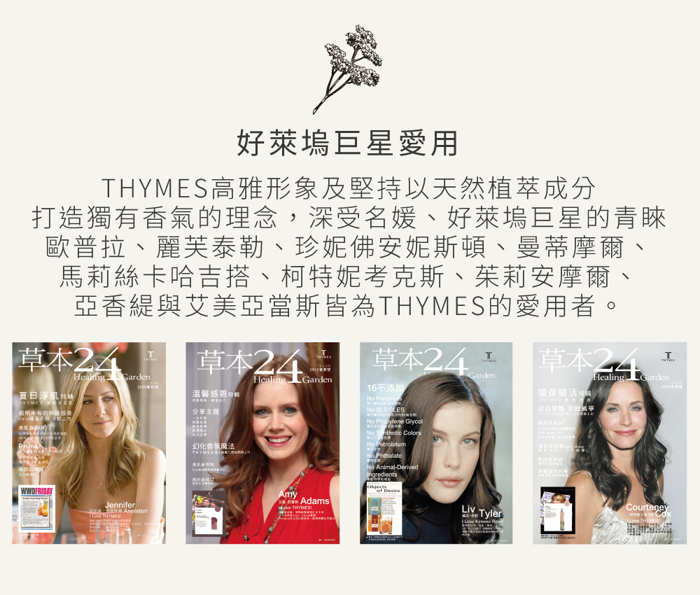 THYMES 的高雅形象及堅持以天然植萃成分打造獨有香氣的理念,受到許多名媛、好萊塢明星的青睞,更獲得歐普拉、麗芙泰勒、珍妮佛安妮斯頓、曼蒂摩爾、馬莉絲卡哈吉搭、柯特妮考克斯、茱莉安摩爾、亞香緹與艾美亞當斯的鍾愛與讚賞。