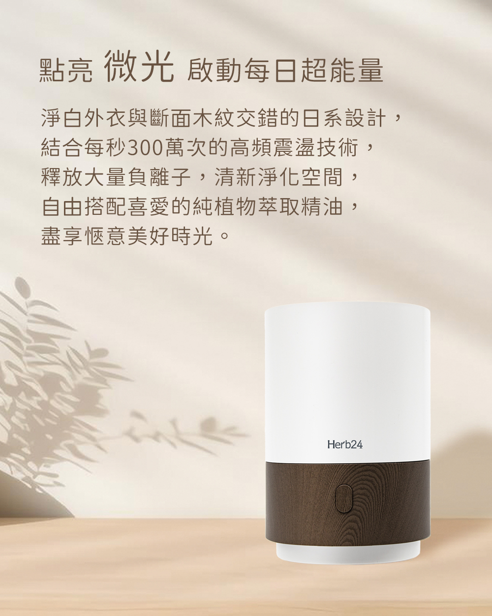 Herb24 微光高頻負離子水氧機,淨白外衣與斷面木紋交錯的日系設計,結合每秒300萬次的高頻震盪技術,釋放大量負離子,清新淨化空間。