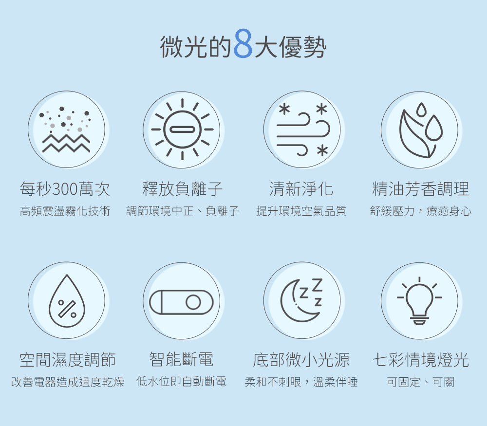 ◆ 每秒 300 萬次高頻震盪◆ 滿水容量100ml,低水位自動斷電◆ 防精油腐蝕材質,免內杯◆ 底部2段燈光模式:可固定七彩燈光或無燈光◆ 連續噴霧4小時以上◆ 適用空間坪數:8~12坪◆ 享原廠安心6個月保固