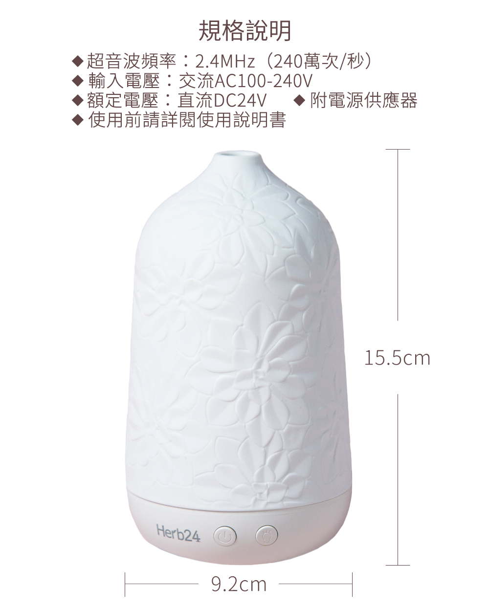 • 本機享一年保固期,除主機外,其他配件或機器骨瓷外殼均不列入保固,如因使用不當、外力因素而造成機台損壞,或使用非純精油以致損壞,亦不在此保固範圍內。