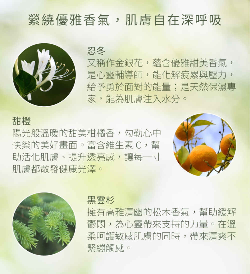 ◆ 多種植物萃取精油,忍冬、甜橙、黑雲杉等◆ 溫和洗淨,柔嫩不緊繃,平衡膚況◆ 縈繞優雅香氣,療瘉舒緩整日的疲憊