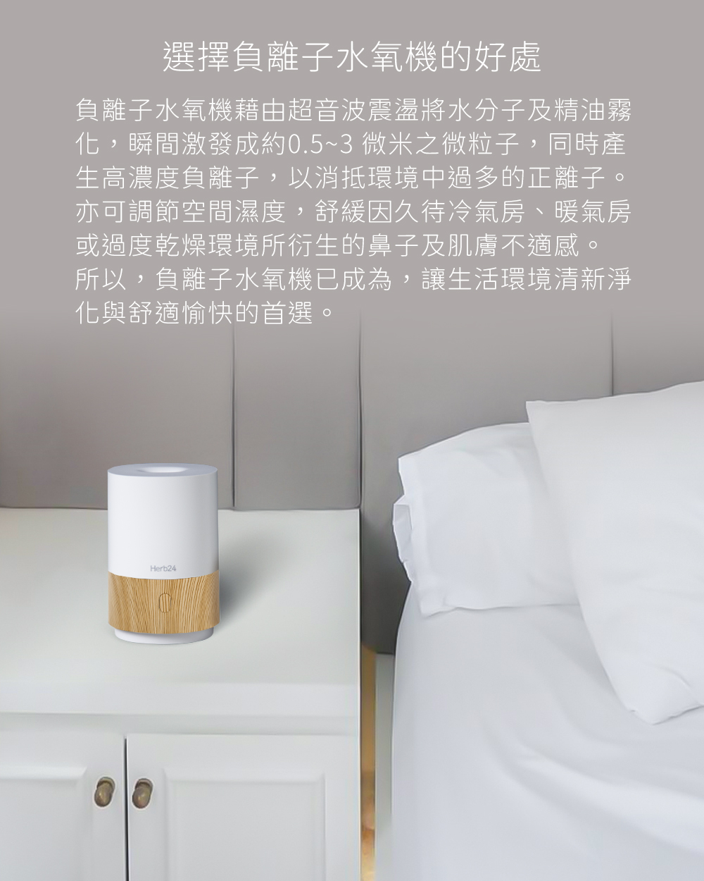 Herb24 微光高頻負離子水氧機,淨白外衣與斷面木紋交錯的日系設計,結合每秒300萬次的高頻震盪技術,釋放大量負離子,清新淨化空間。