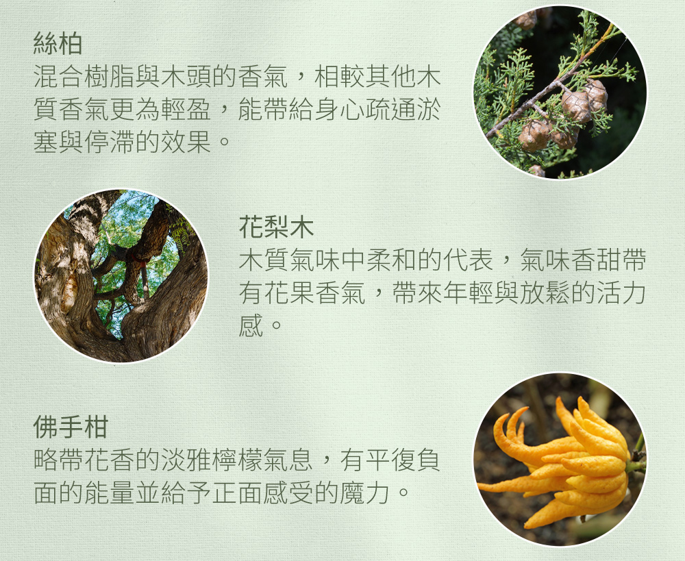森林氣息的木質複方香調,清新林木與沉穩木質層層交織,彷彿漫步林間,讓身心回到自然與平衡。