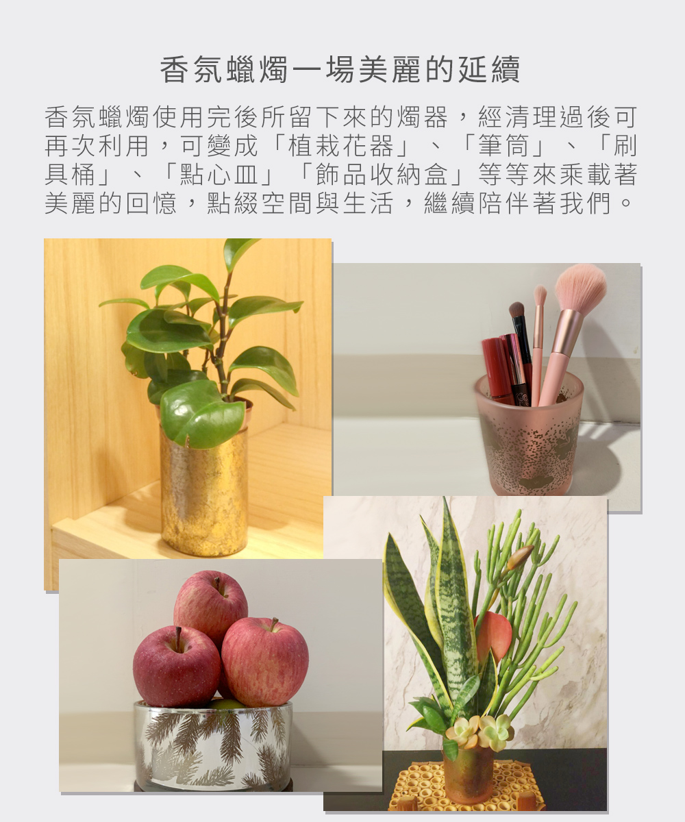 香氛蠟燭使用完後所留下來的燭器,經清理過後可再次利用,可變成「植栽花器」、「筆筒」、「刷具桶」、「點心皿」、「飾品收納盒」...等等來乘載著美麗的回憶,點綴空間與生活,繼續陪伴著我們。